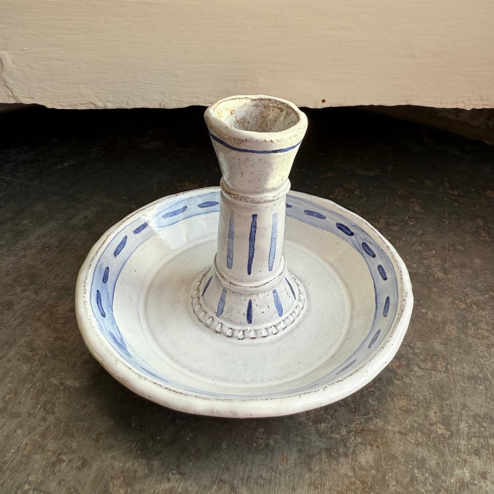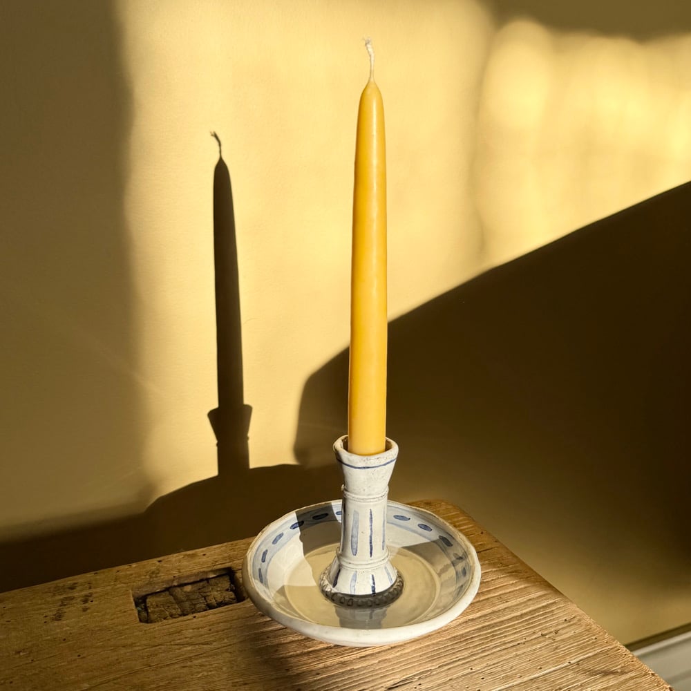 This candlestick is made from red high-firing terracotta clay with a white tin glaze and cobalt oxide decoration. It is handbuilt with wobbly lines and edges, and little ‘imperfections’ that make it unique. Candle not included.