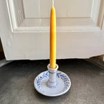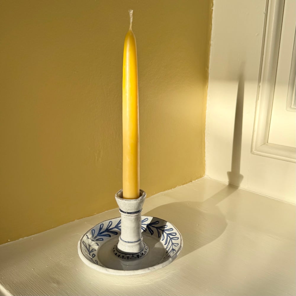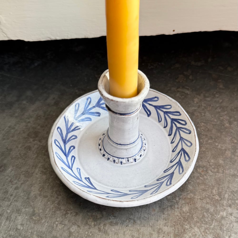 This candlestick is made from red high-firing terracotta clay with a white tin glaze and cobalt oxide decoration. It is handbuilt with wobbly lines and edges, and little ‘imperfections’ that make it unique. Candle not included.
