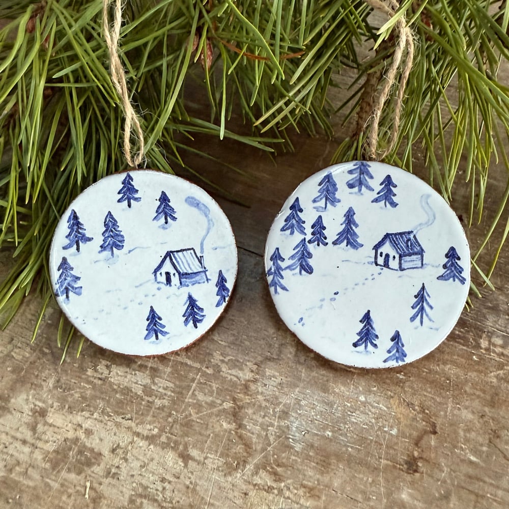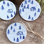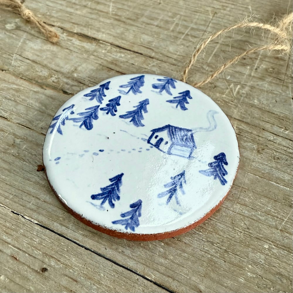 This ornament is handmade from deep red high-firing terracotta, decorated with white glaze and painted with blue cobalt oxide. Each one is hand painted and unique, with the decoration varying slightly, so they may differ a little from those pictured. Finished with a jute cord. The price is for one single decoration.