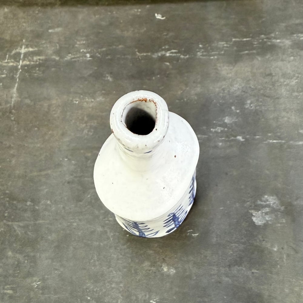 This tiny bottle vase is made from red high-firing terracotta clay with a white tin glaze and cobalt oxide decoration. It is handbuilt with wobbly lines and edges, and little ‘imperfections’ that make it unique.