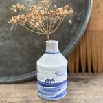 This bottle vase is made from red high-firing terracotta clay with a white tin glaze and cobalt oxide decoration. It is handbuilt with wobbly lines and edges, and little ‘imperfections’ that make it unique.