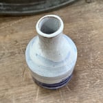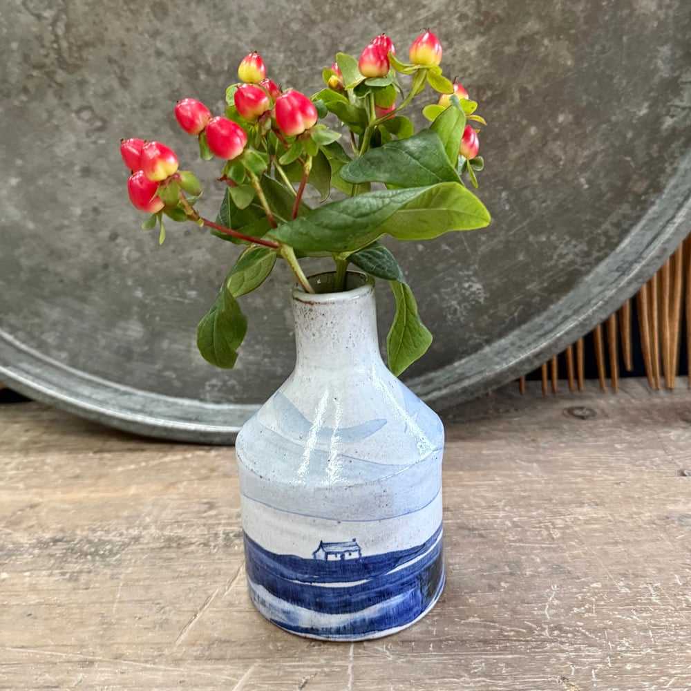 This little bottle vase is made from red high-firing terracotta clay with a white tin glaze and cobalt oxide decoration. It is handbuilt with wobbly lines and edges, and little ‘imperfections’ that make it unique.