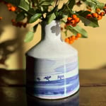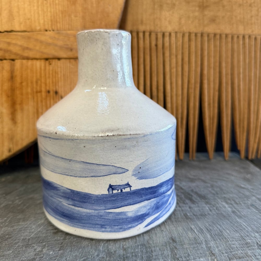 This bottle vase is made from red high-firing terracotta clay with a white tin glaze and cobalt oxide decoration. It is handbuilt with wobbly lines and edges, and little ‘imperfections’ that make it unique. This vase has two little cottages painted on opposite sides of the body, so can be turned to show different scenes.