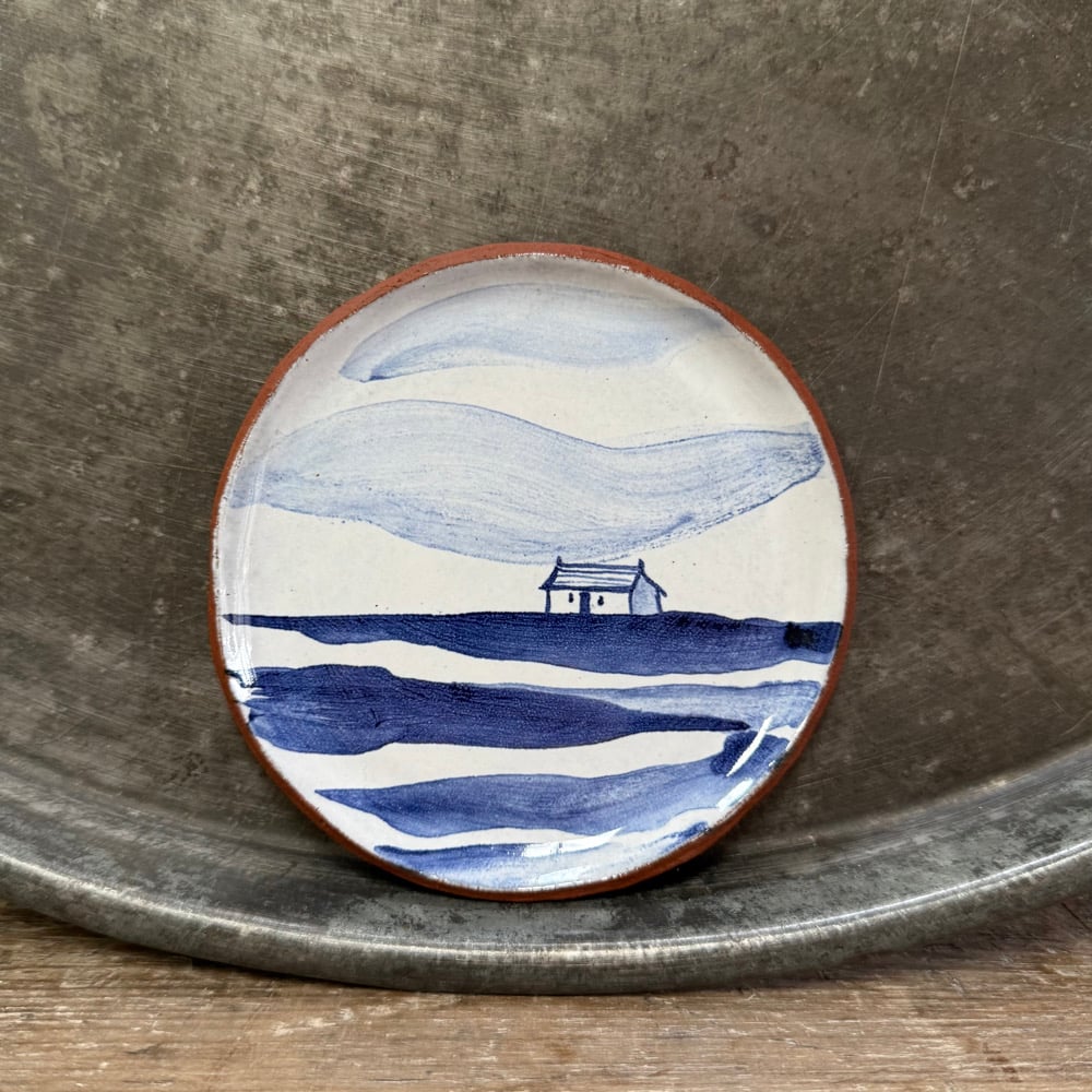 This little trinket dish is made from deep red high-firing terracotta clay with a white tin glaze and cobalt oxide decoration. It is handbuilt with wobbly edges and little ‘imperfections’ that make it unique.