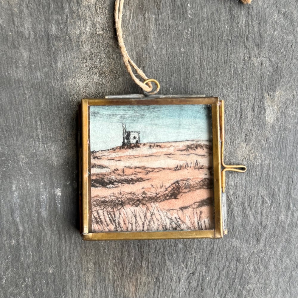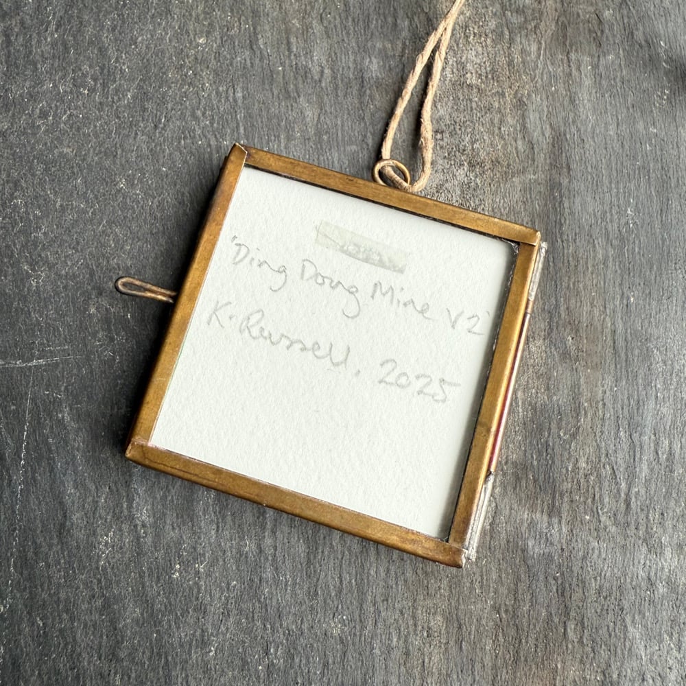 Signed on the reverse and framed in a small, brass, floating glass hanging frame.