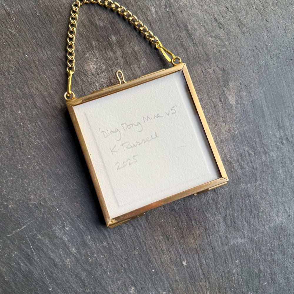Signed on the reverse and framed in a gold brass floating glass hanging frame.
