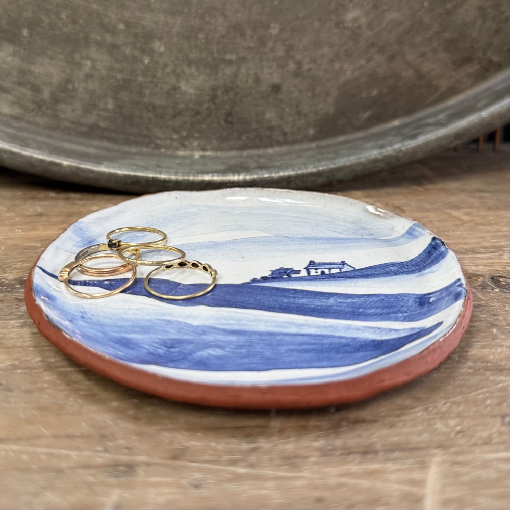 This little trinket dish is made from deep red high-firing terracotta clay with a white tin glaze and cobalt oxide decoration. It is handbuilt with wobbly edges and little ‘imperfections’ that make it unique.