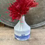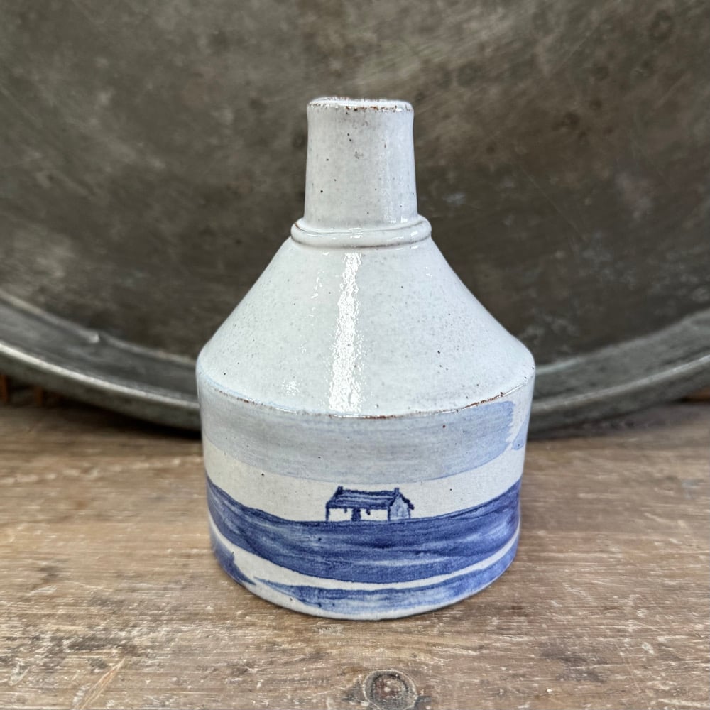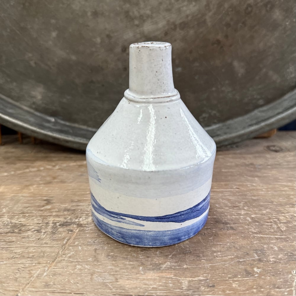 This little bottle vase is made from red high-firing terracotta clay with a white tin glaze and cobalt oxide decoration. It is handbuilt with wobbly lines and edges, and little ‘imperfections’ that make it unique.