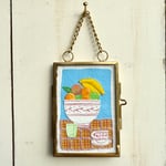 This little picture is a combination of gouache painting, collage and embroidery on cotton rag paper. Signed on the reverse and framed in a small, brass, floating glass hanging frame.