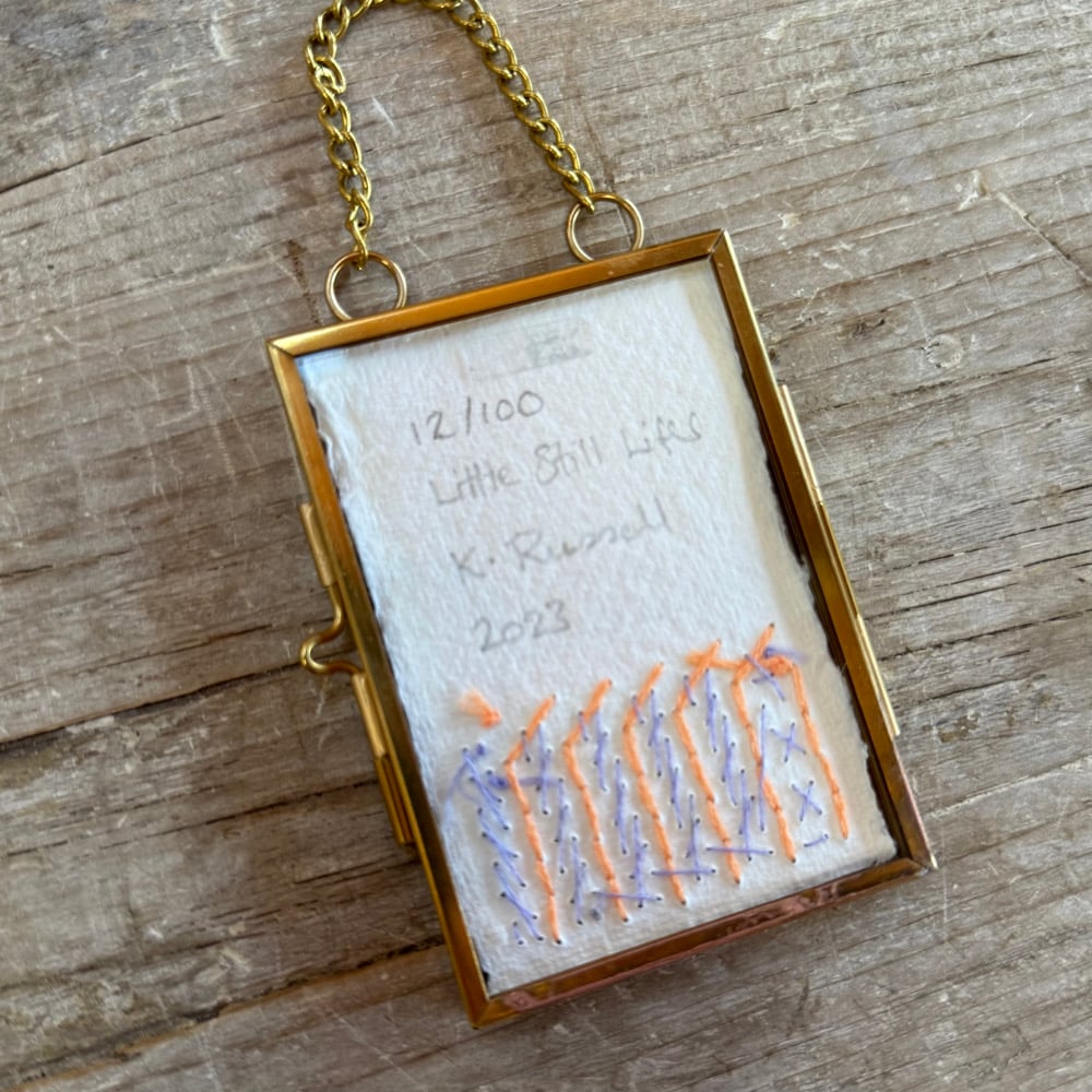 This little picture is a combination of gouache painting, collage and embroidery on cotton rag paper. Signed on the reverse and framed in a small, brass, floating glass hanging frame.