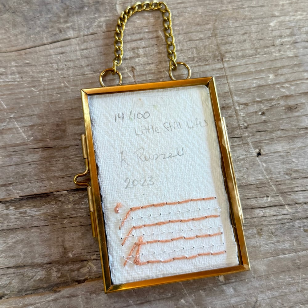 This little picture is a combination of gouache painting, collage and embroidery on cotton rag paper. Signed on the reverse and framed in a small, brass, floating glass hanging frame.