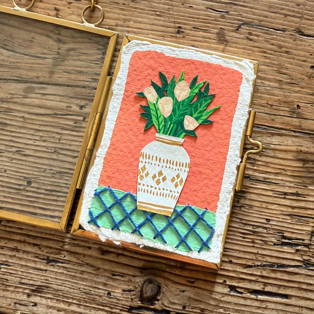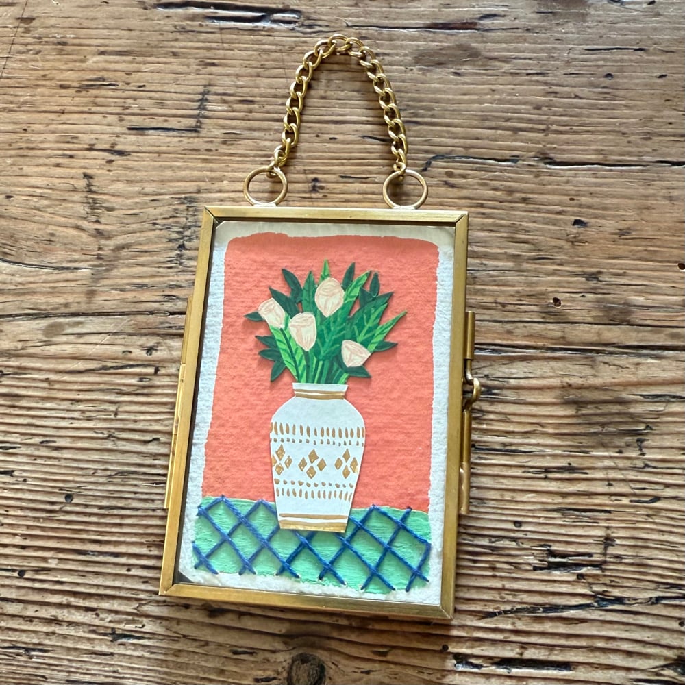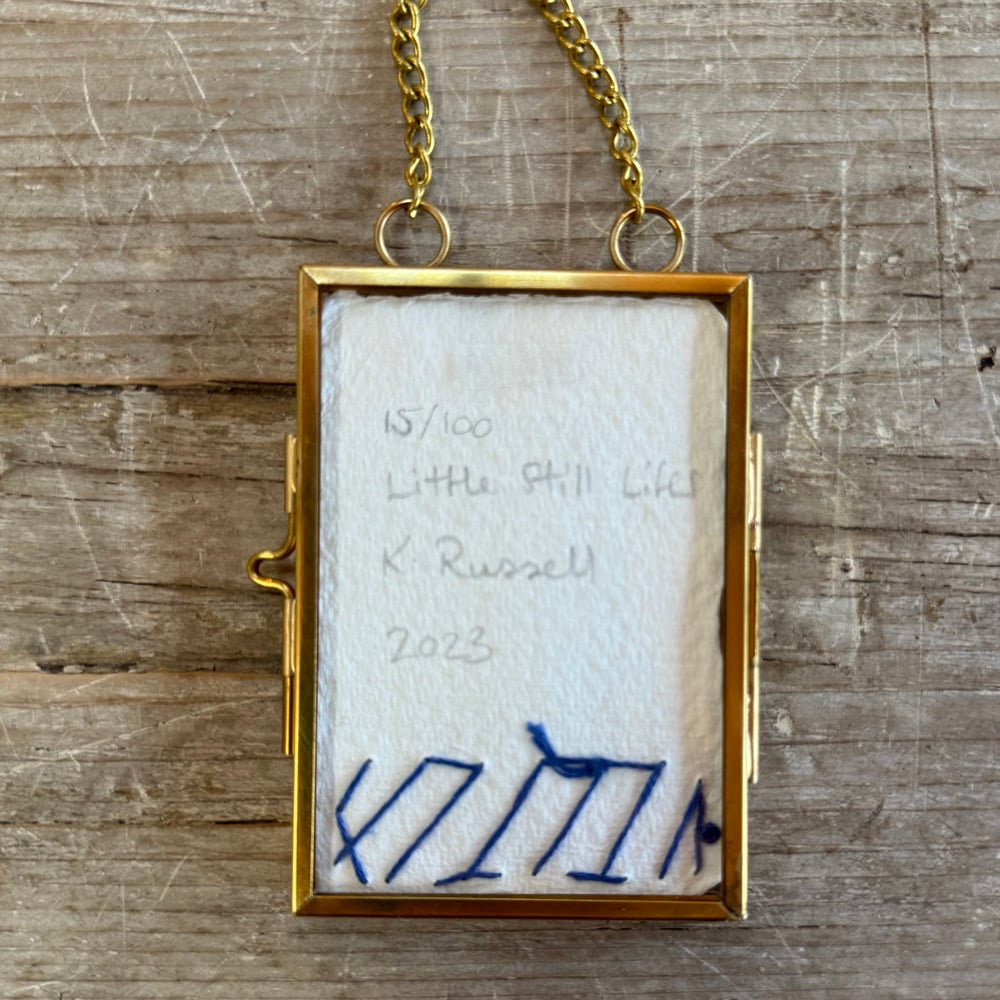 This little picture is a combination of gouache painting, collage and embroidery on cotton rag paper. Signed on the reverse and framed in a small, brass, floating glass hanging frame.