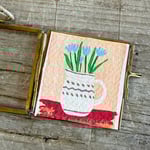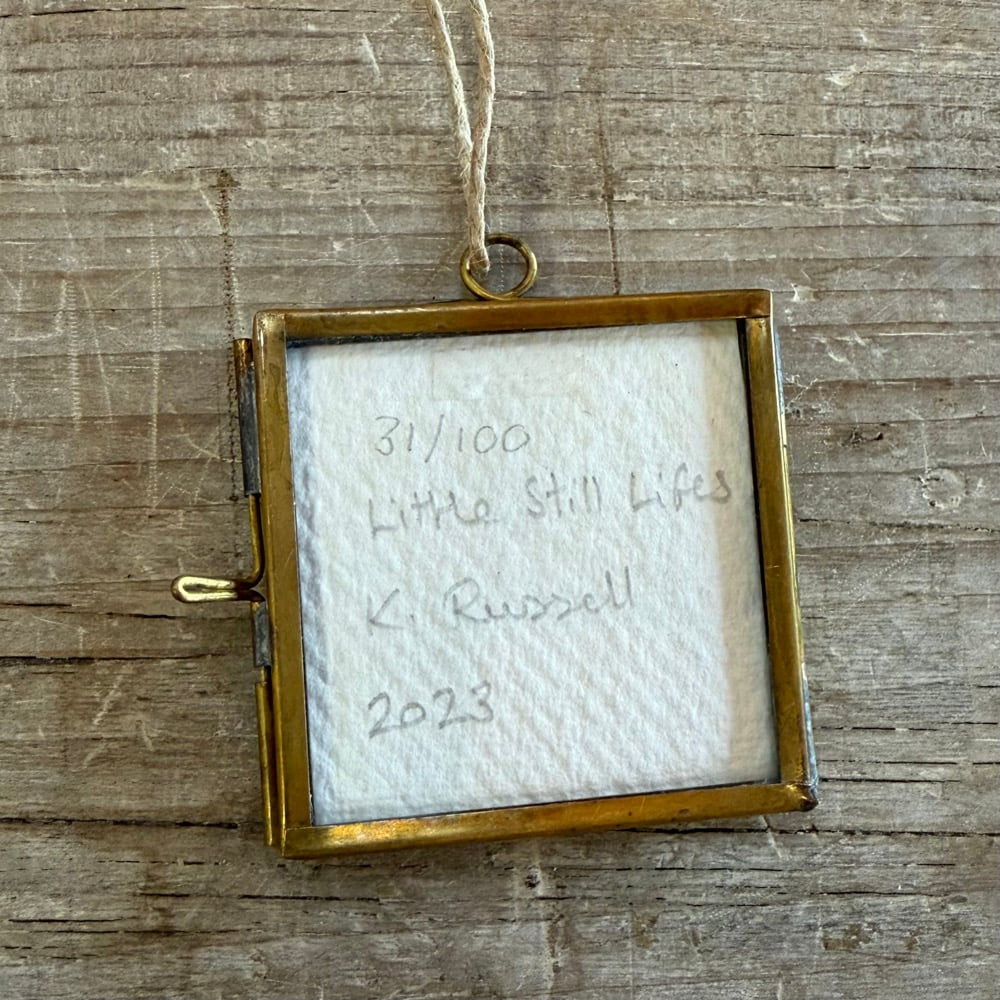 This little painting is gouache on cotton rag paper. Signed on the reverse and framed in a small, brass, floating glass hanging frame.