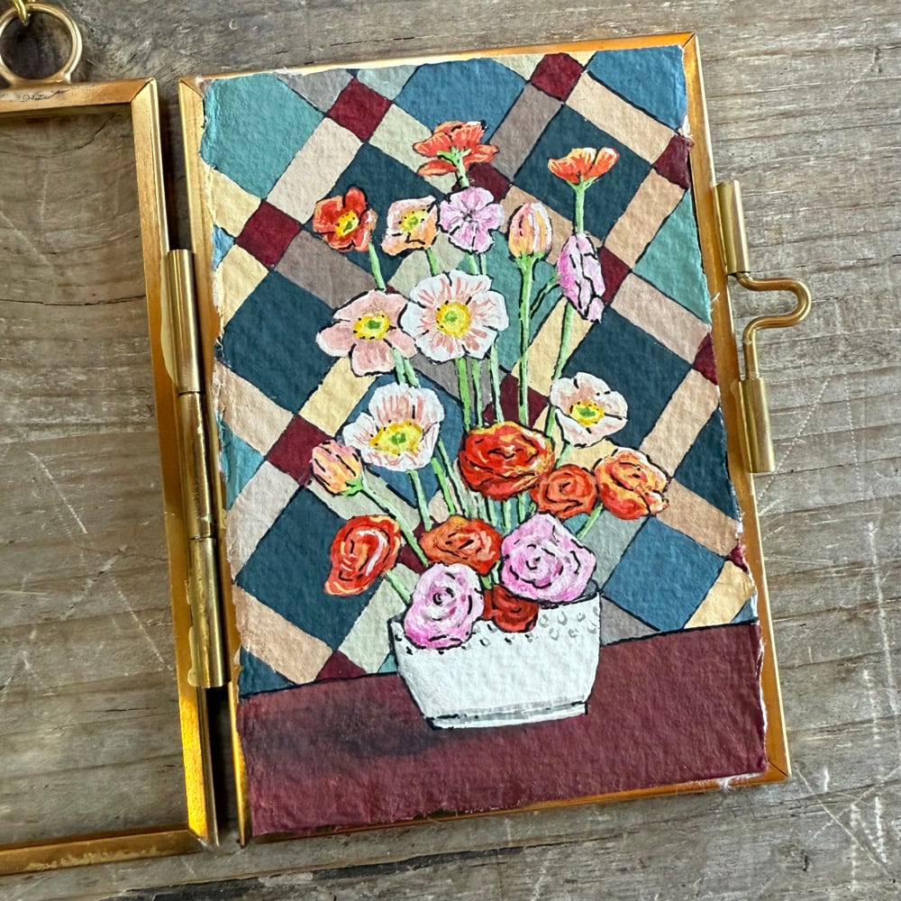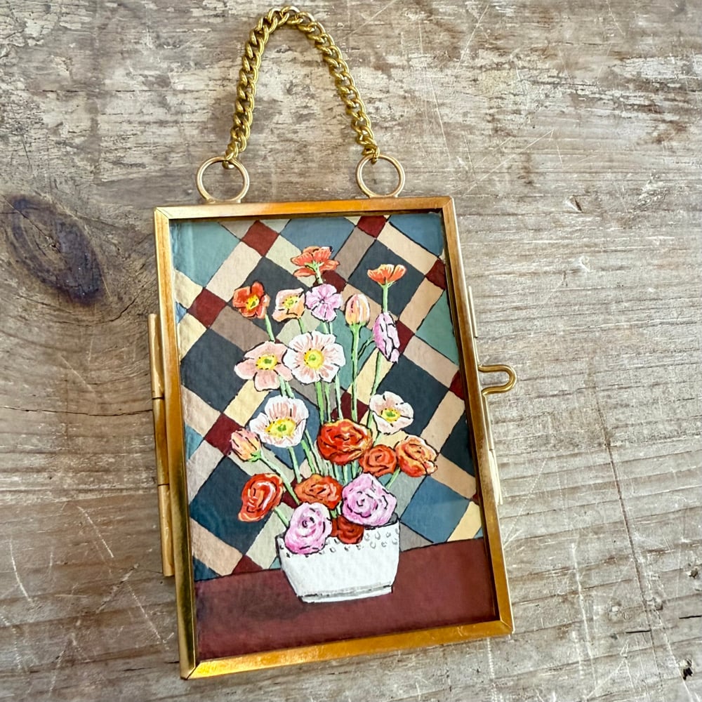 Signed on the reverse and framed in a small, brass, floating glass hanging frame.