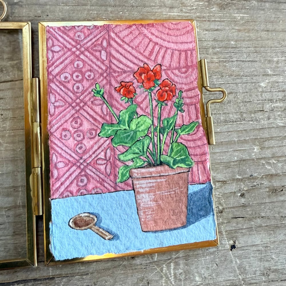 Signed on the reverse and framed in a small, brass, floating glass hanging frame.