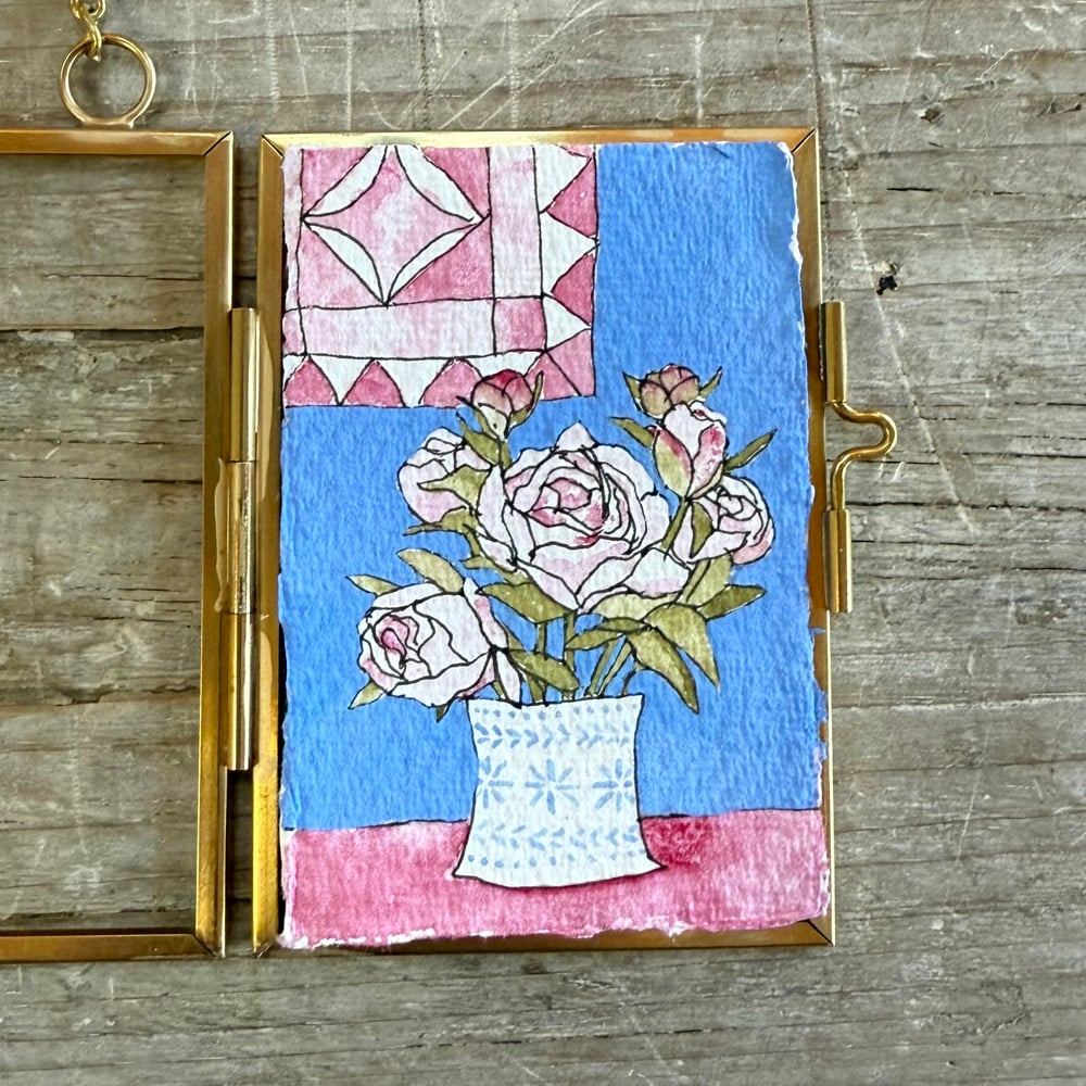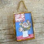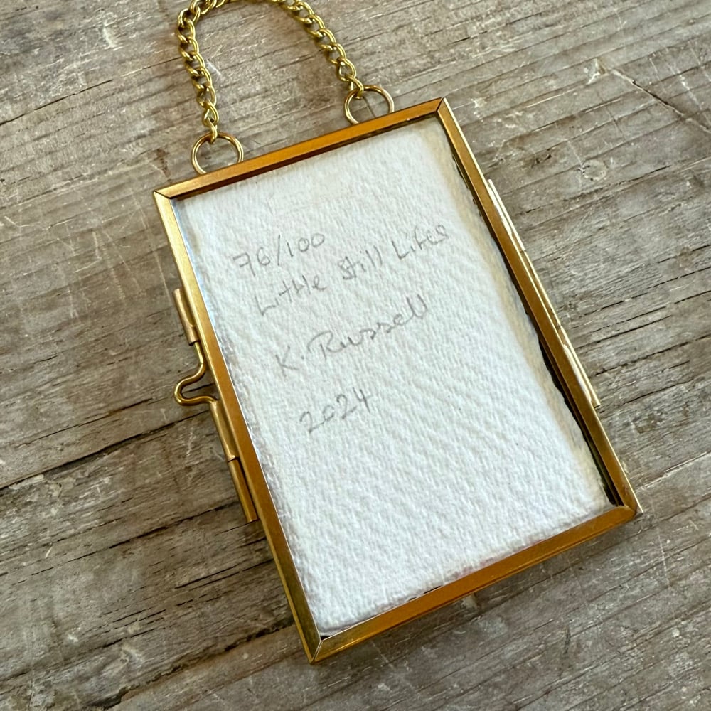 Signed on the reverse and framed in a small, brass, floating glass hanging frame.