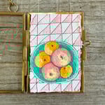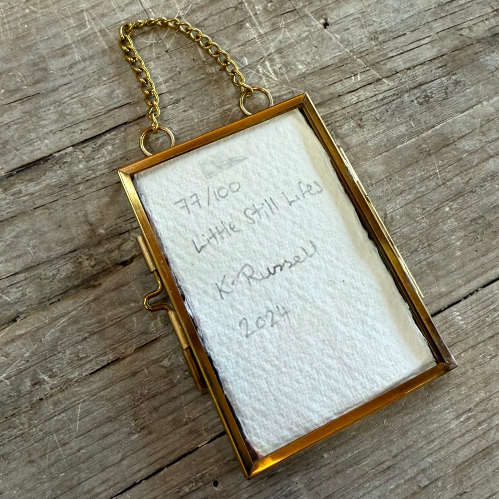 Signed on the reverse and framed in a small, brass, floating glass hanging frame.