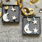 Size: moon approx. 5cm tall, white and gold stars approx. 3.5cm, not including ribbons.