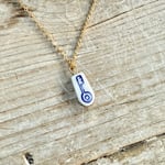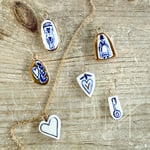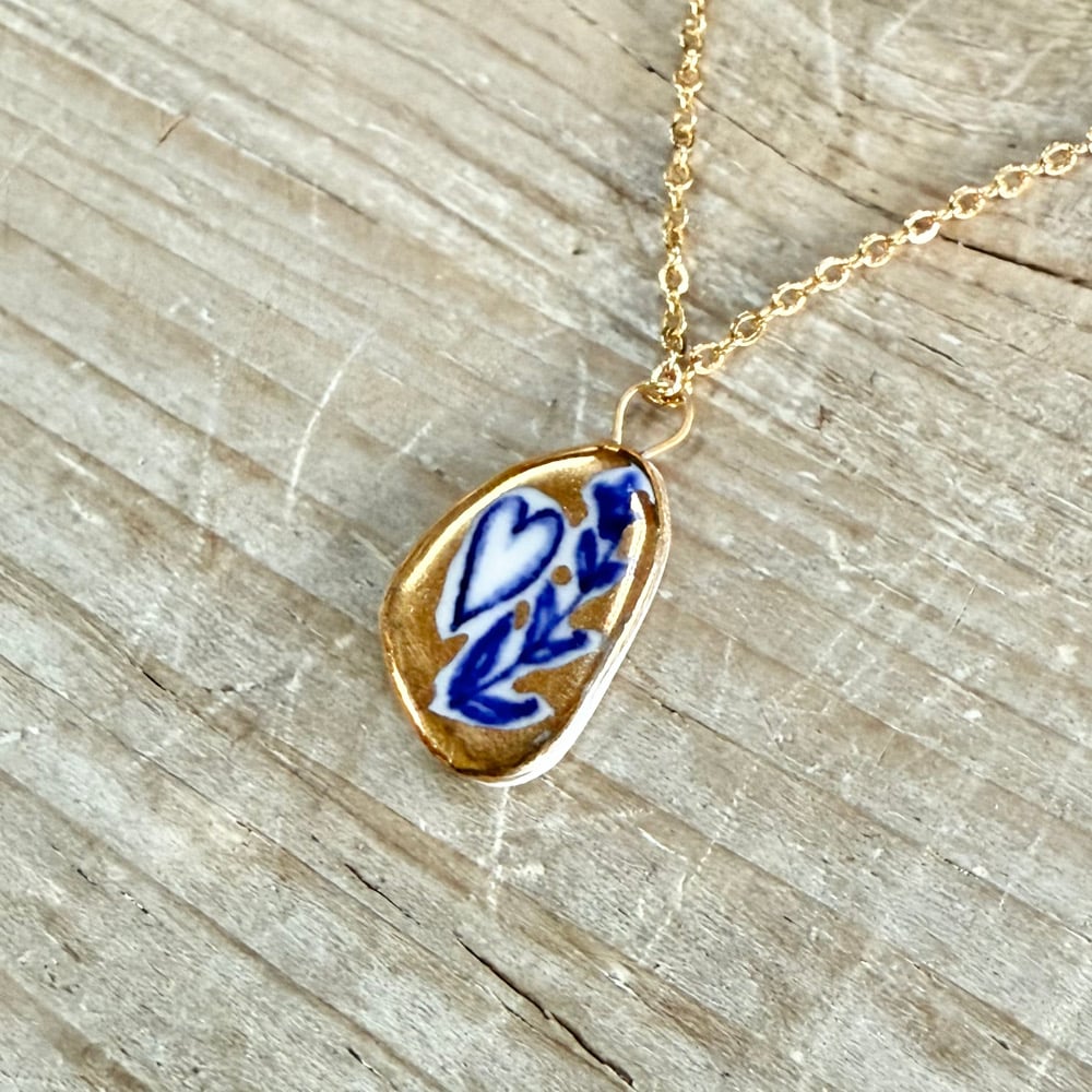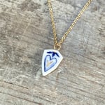 Little porcelain pendant decorated with cobalt oxide and gold lustre. Plain white porcelain on reverse.