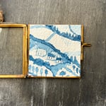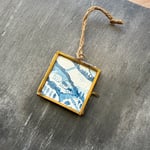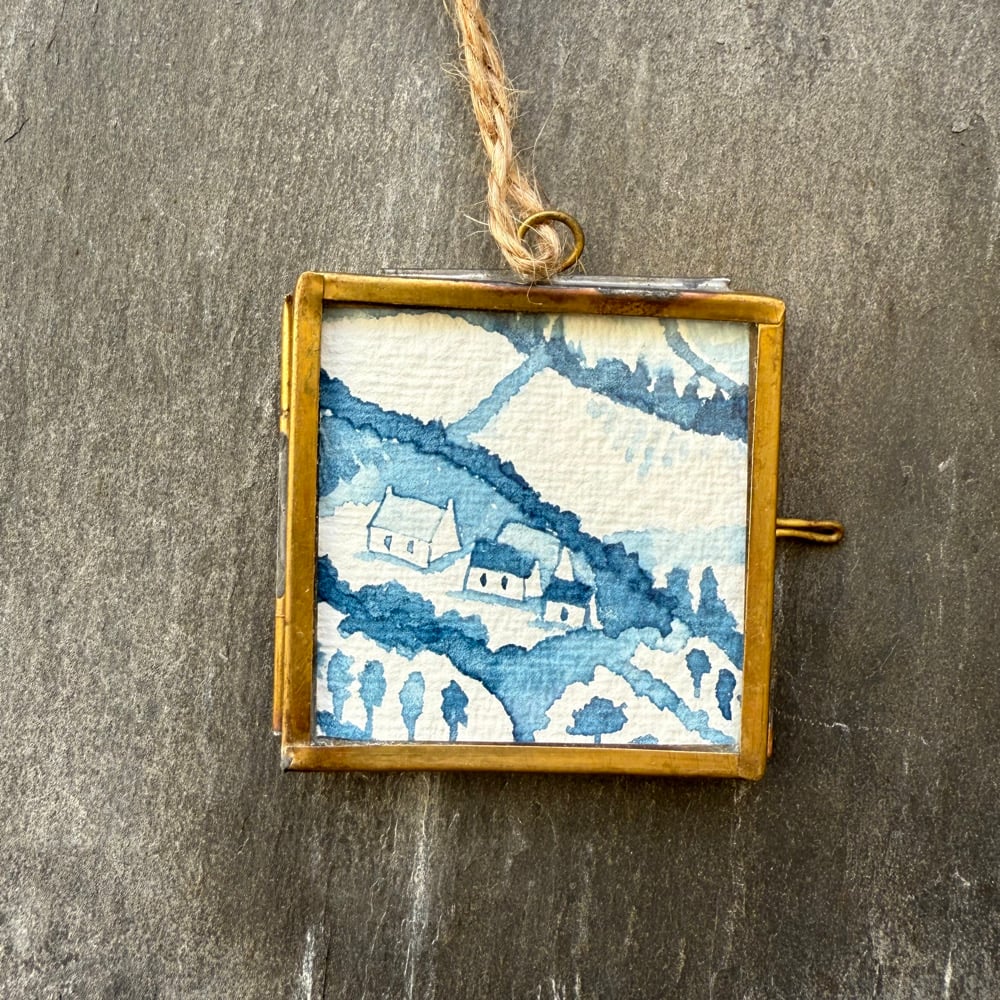 Signed on the reverse and framed in a small, brass, floating glass hanging frame.