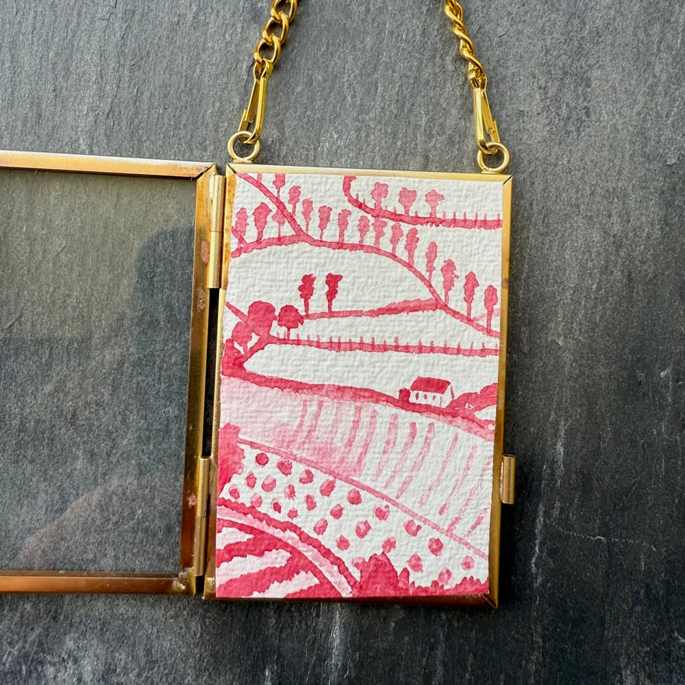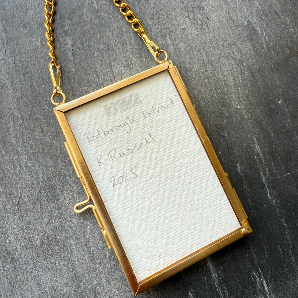 Signed on the reverse and framed in a small, brass, floating glass hanging frame.