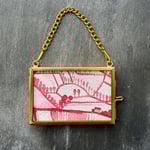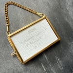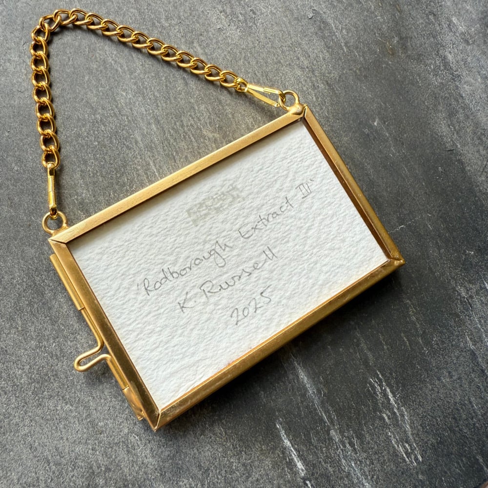 Signed on the reverse and framed in a small, brass, floating glass hanging frame.