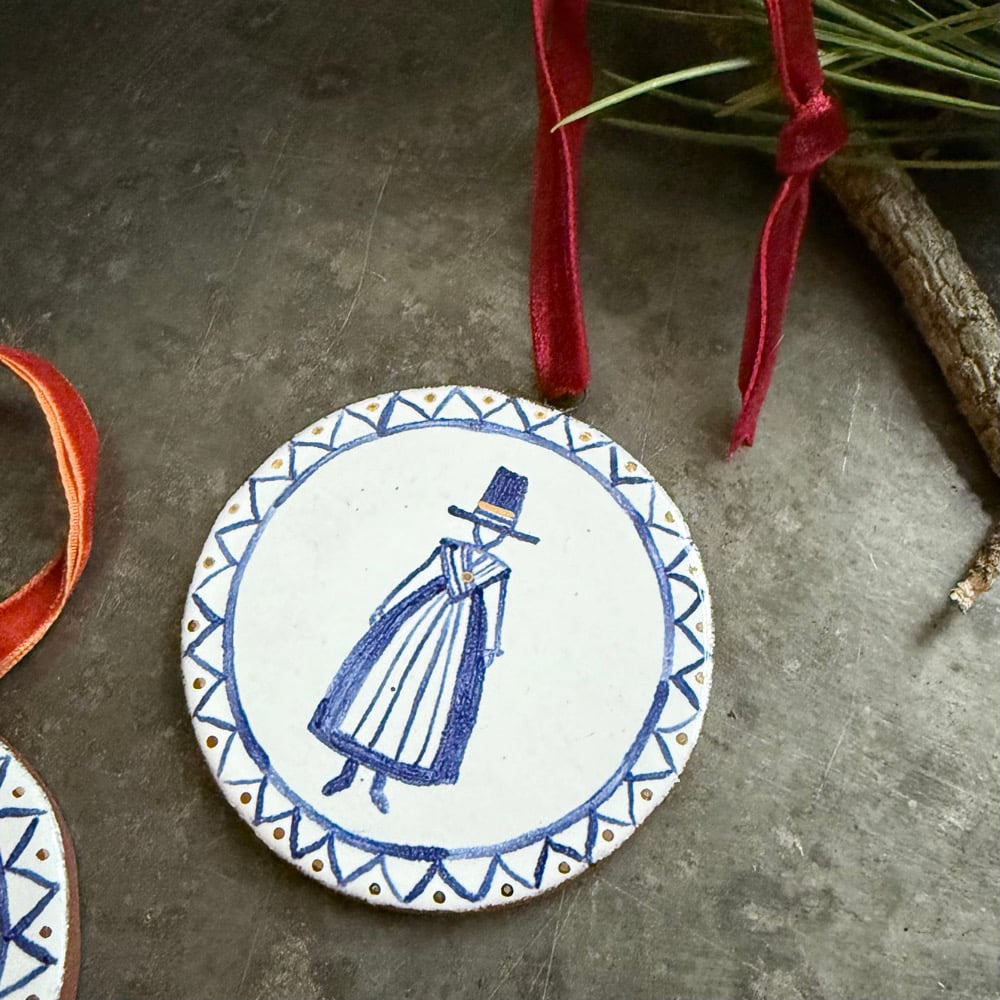 This ornament is handmade from deep red high-firing terracotta, decorated with white glaze and painted with blue cobalt oxide and gold lustre details. Each one is hand painted and unique, with the decoration varying slightly, so they may differ a little from those pictured. Finished with a velvet ribbon.
