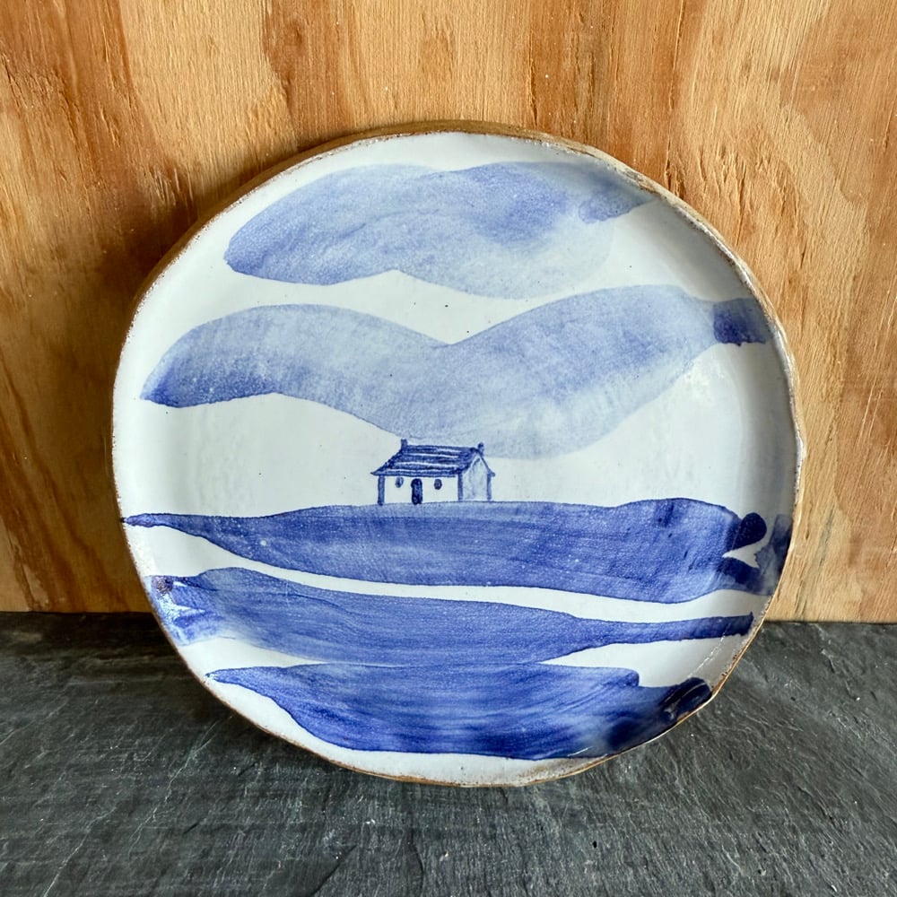 This little plate is made from buff coloured clay with a white tin glaze and cobalt oxide decoration. It is handbuilt with wobbly edges and little ‘imperfections’ that make it unique.