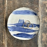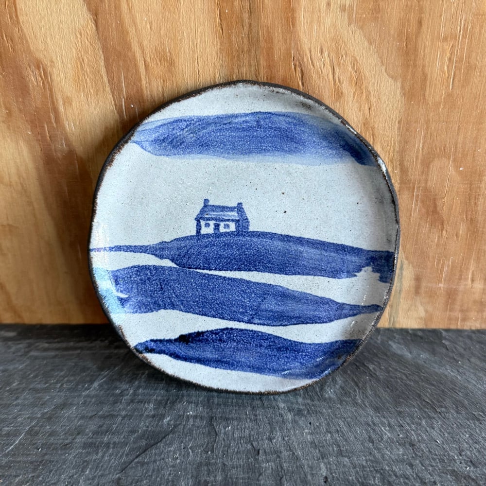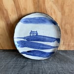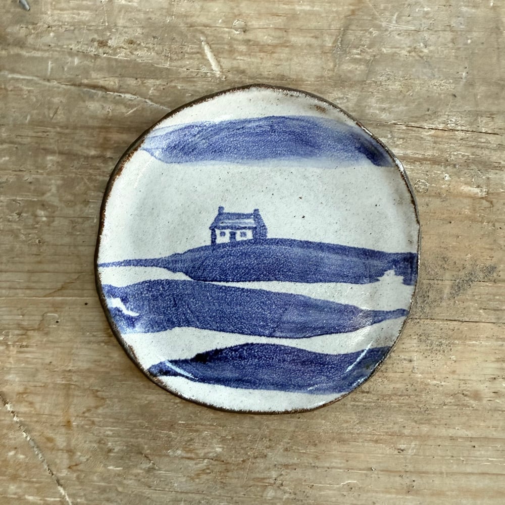 This little trinket dish is made from black stoneware clay with a white tin glaze and cobalt oxide decoration. It is handbuilt with wobbly edges and little ‘imperfections’ that make it unique.