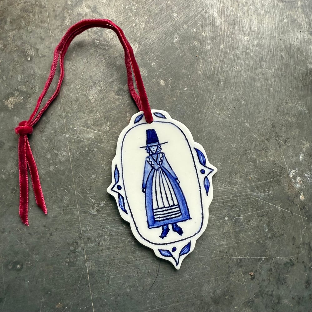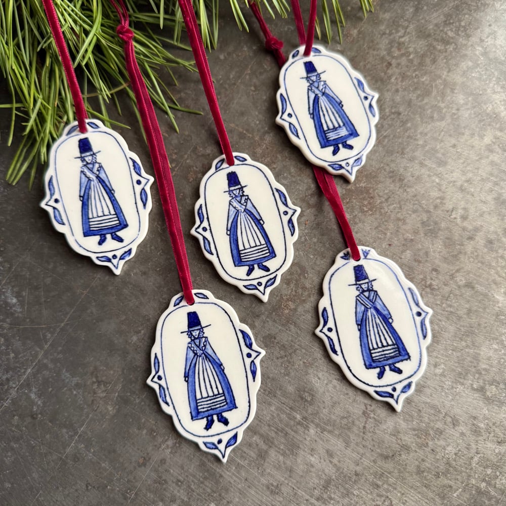 This ornament is handmade from porcelain and painted with cobalt oxide decoration. Finished with a thin burgundy red velvet ribbon.