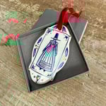 This ornament is handmade from porcelain, and painted with cobalt oxide decoration and gold lustre details. Finished with a burgundy red velvet ribbon and presented in a quality card box, making it a perfect gift.