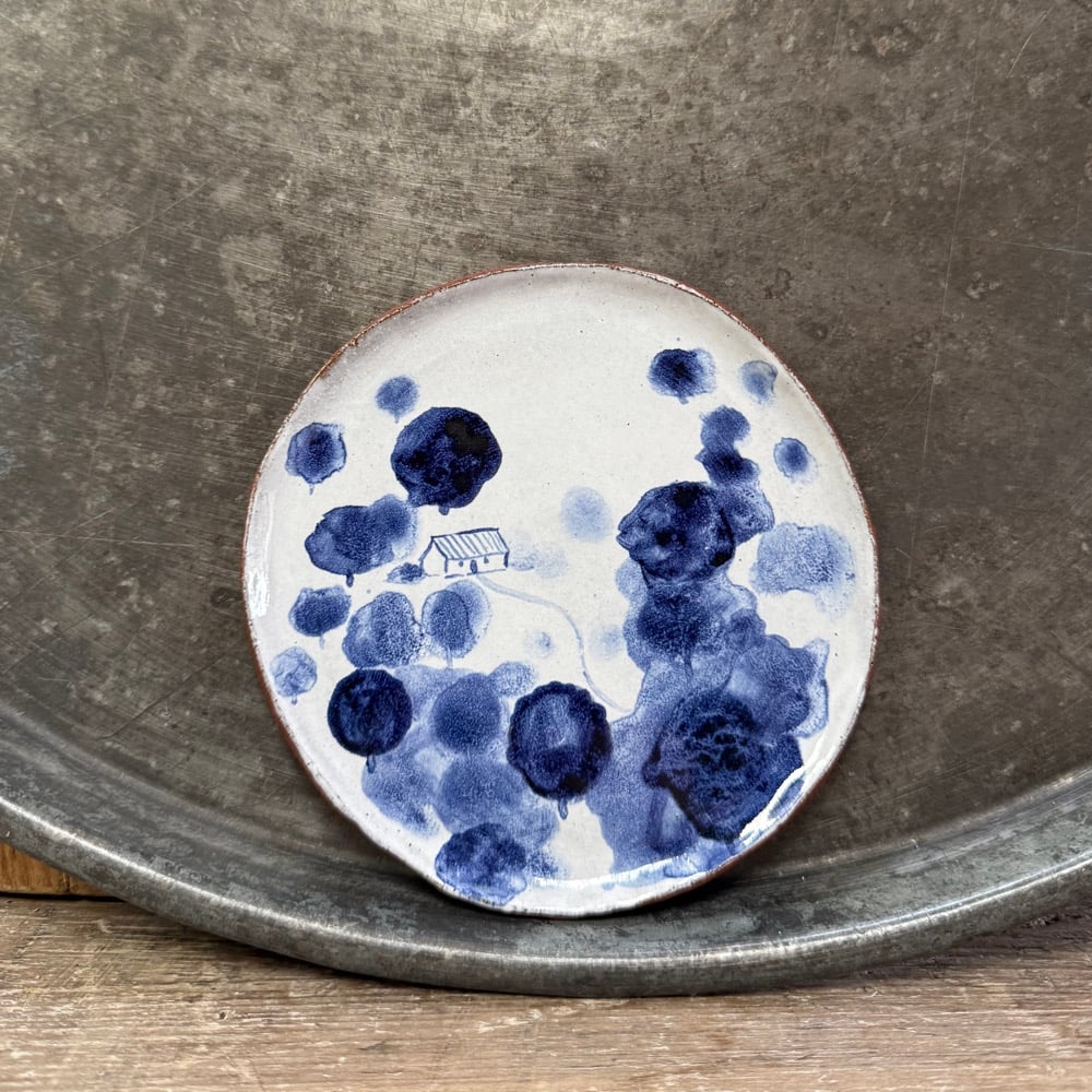 This little plate is made from deep red high-fired terracotta clay with a white tin glaze and cobalt oxide decoration. It is handbuilt with wobbly edges and little ‘imperfections’ that make it unique.