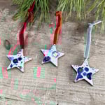 This ornament is handmade from deep red high-firing terracotta, decorated with white glaze, blue cobalt oxide and gold lustre. Finished with a velvet ribbon.