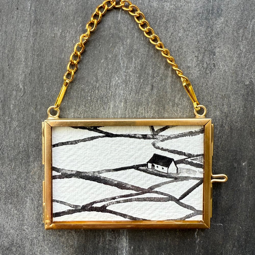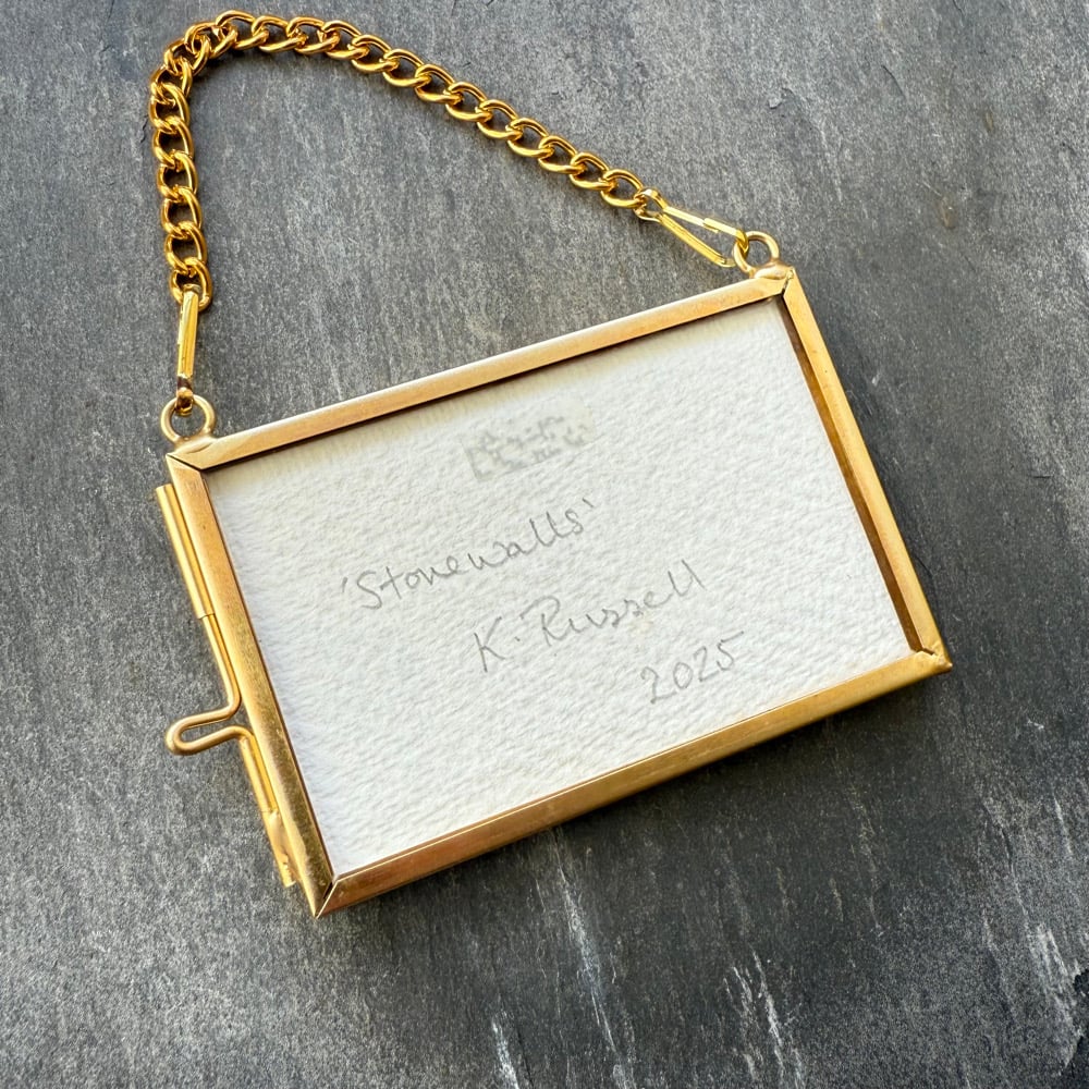 Signed on the reverse and framed in a small, brass, floating glass hanging frame.