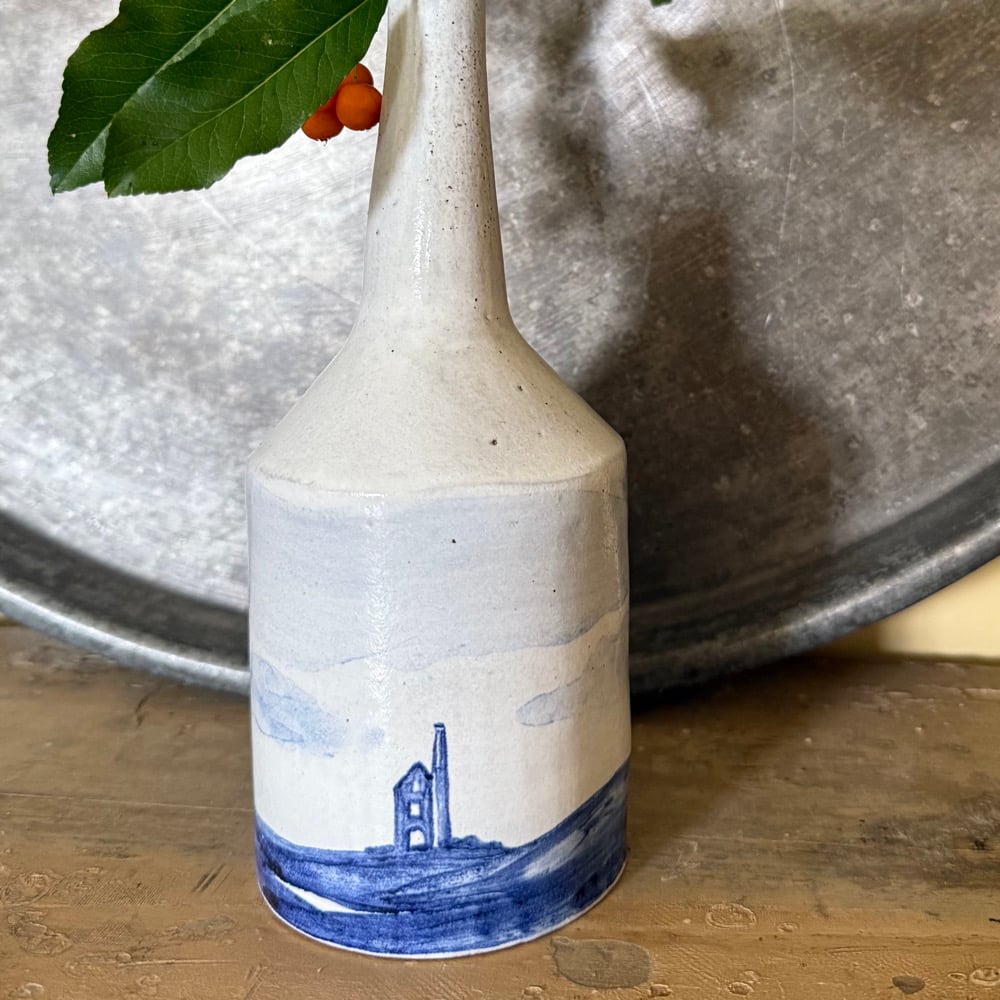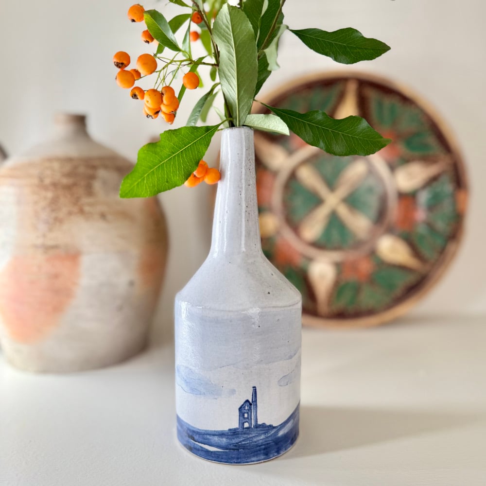 This bottle vase is made from red high-firing terracotta clay with a white tin glaze and cobalt oxide decoration. It is handbuilt with wobbly lines and edges, and little ‘imperfections’ that make it unique. The neck of this bottle tilts back very slightly, which I think makes it look jolly, but it’s a quirk to be aware of (see photos).