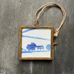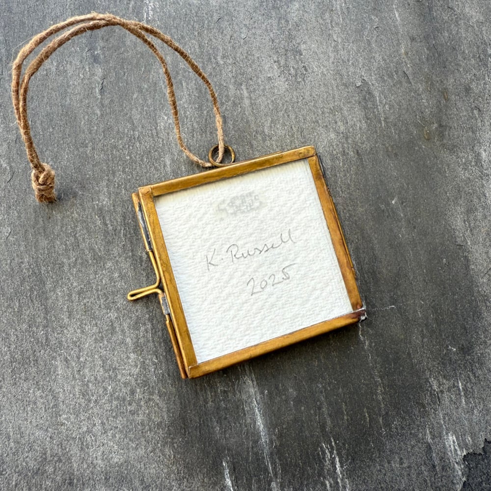 Signed on the reverse and framed in a small, brass, floating glass hanging frame.