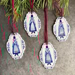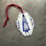 This ornament is handmade from porcelain and painted with cobalt oxide decoration. Finished with a thin burgundy red velvet ribbon. These are ‘seconds’ due to come blurry edges in the decoration.