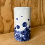 This vase is made from black stoneware clay with a speckled white tin glaze and cobalt oxide decoration. It is handbuilt with wobbly line and edges, and little ‘imperfections’ that make it unique.