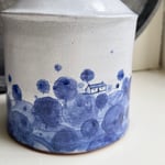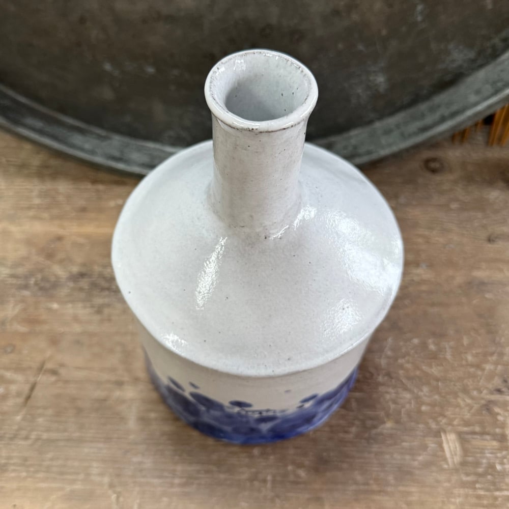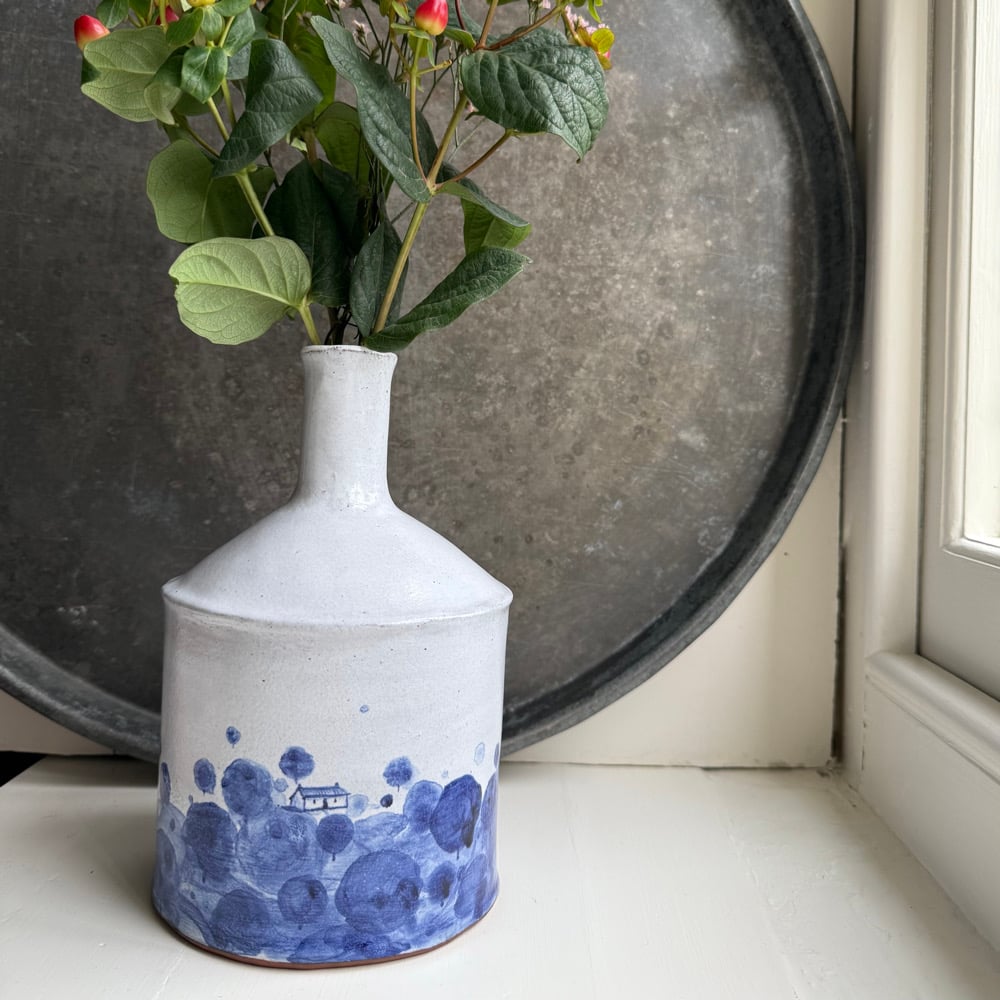 This bottle vase is made from red high-firing terracotta clay with a white tin glaze and cobalt oxide decoration. It is handbuilt with wobbly lines and edges, and little ‘imperfections’ that make it unique.