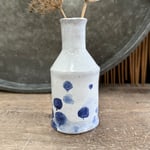 This little bottle vase is made from red high-firing terracotta clay with a white tin glaze and cobalt oxide decoration. It is handbuilt with wobbly lines and edges, and little ‘imperfections’ that make it unique.