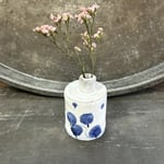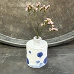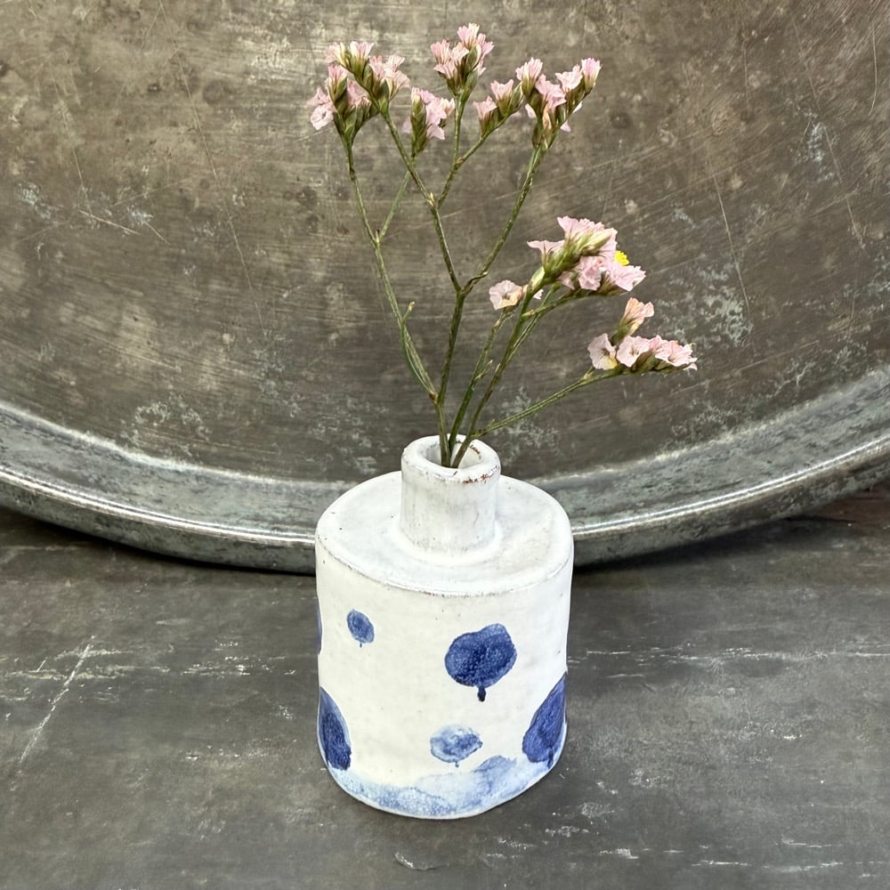 This tiny bottle vase is made from red high-firing terracotta clay with a white tin glaze and cobalt oxide decoration. It is handbuilt with wobbly lines and edges, and little ‘imperfections’ that make it unique.
