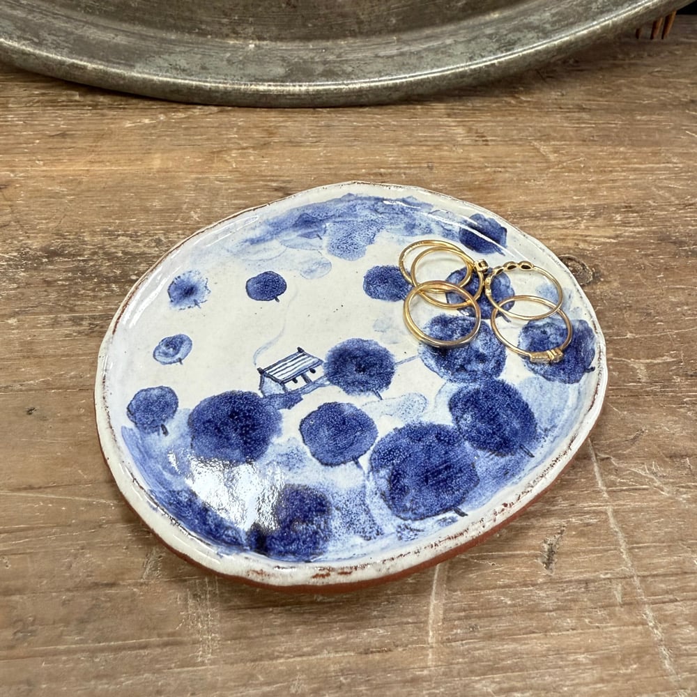 This little trinket dish is made from deep red high-firing terracotta clay with a white tin glaze and cobalt oxide decoration. It is handbuilt with wobbly edges and little ‘imperfections’ that make it unique.